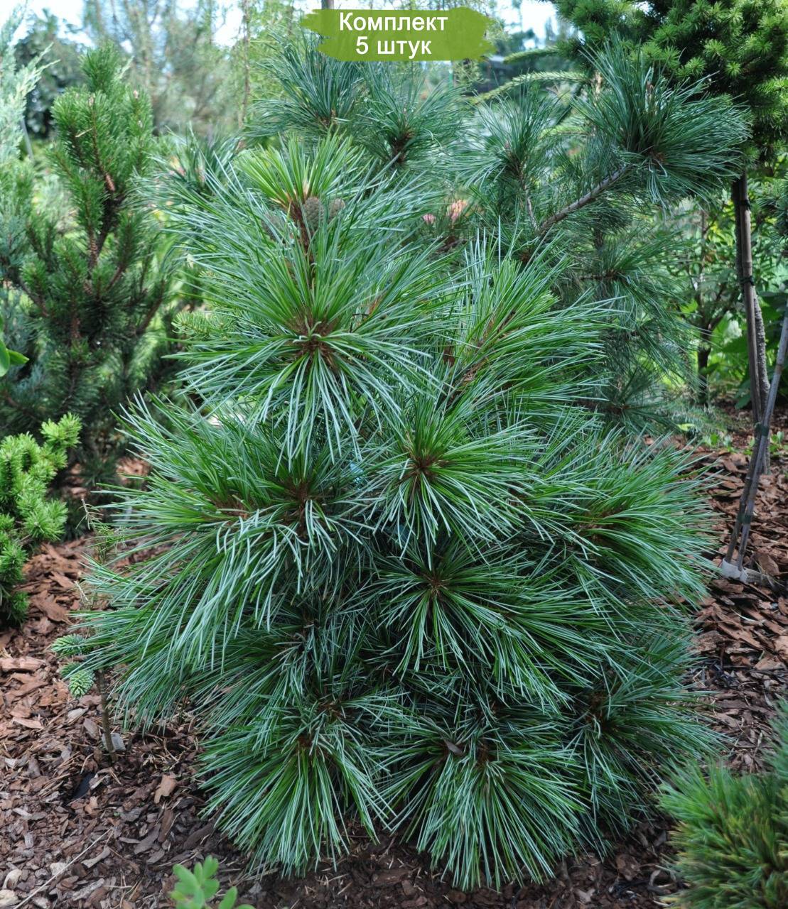 Комплект из пяти саженцев корейского кедра размером от 20 до 40 см предлагается по привлекательной цене, эквивалентной стоимости четырех саженцев. Корейский кедр отличается внушительной и плотной кроной. У молодых деревьев форма кроны ближе к округло-овальной, тогда как у более старых она принимает цилиндрическую или конусообразную форму. С возрастом на деревьях может появляться несколько вершин, что связано с различными факторами, включая естественные процессы старения, когда дерево стремится максимизировать поглощение питательных веществ и увеличить производство шишек. Также существует версия, что вершины могут обламываться под весом шишек или повреждаться медведями, которые лазают по деревьям в поисках шишек.