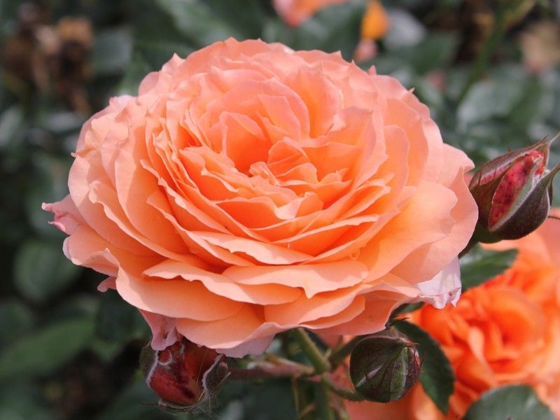 Цветки крупные, густомахровые, диаметром от 8 до 13 см, состоящие из 26-40 волнистых лепестков. По мере распускания форма цветка меняется от округлого бутона до чашевидной. Нераскрывшиеся бутоны имеют оранжевый оттенок, а полностью распустившиеся цветки приобретают оранжево-персиковый цвет. Цветки собраны в небольшие соцветия по 5 бутонов.