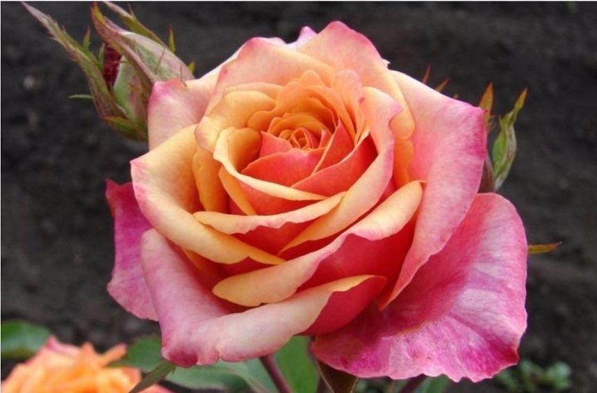 Чайно-гибридная роза Черри Бренди (Cherry Brandy) – это великолепный сорт, который привлекает внимание своим уникальным цветом лепестков. Цветок имеет удлиненный центр и состоит из махровых лепестков, количество которых достигает 45. Диаметр цветка составляет около 8-10 сантиметров. Лепестки у основания имеют ржавый оттенок, который плавно переходит в темно-оранжевый, а внешние лепестки окрашены в бледно-вишневый цвет. Стебель розы практически лишен шипов, что делает её ещё более привлекательной. Бутон плотный и обладает легким ароматом, распускается постепенно. Высота куста достигает 120 см. Этот сорт отличается высокой устойчивостью к заболеваниям и низким температурам.