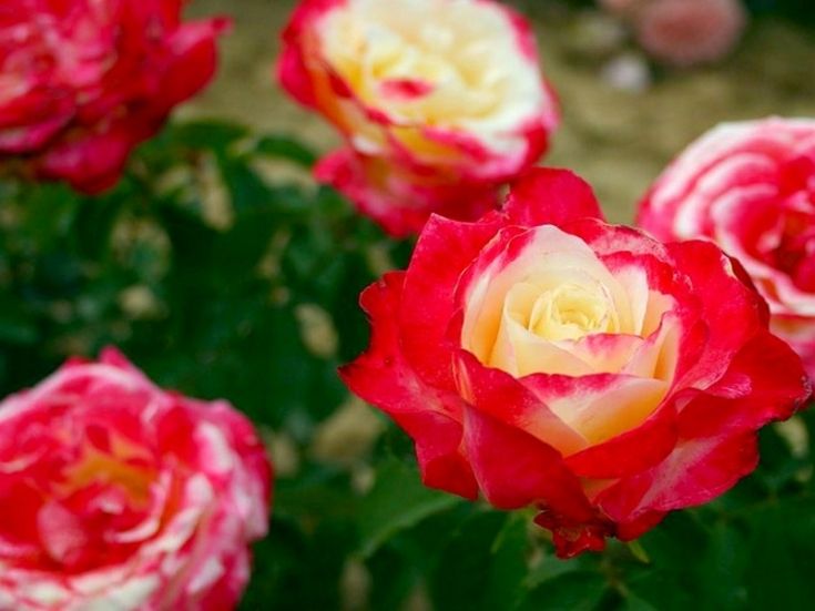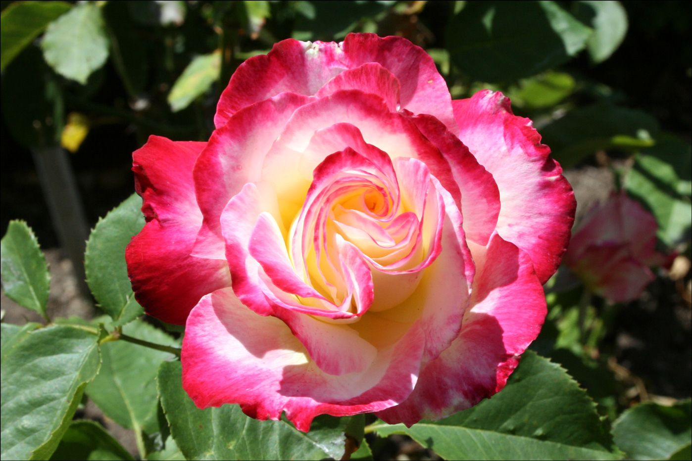 Роза Дабл Делайт (Double Delight) – это одна из самых популярных и узнаваемых современных роз в мире. Название сорта может быть связано как с контрастными цветами, так и с сочетанием цвета и аромата. Бутоны этой розы имеют классическую форму и медленно раскрываются, долго сохраняя свежесть в срезке. Вначале цветки кремово-белые с красными краями, но по мере распускания малиновый оттенок распространяется, особенно в жаркую погоду. В результате получается потрясающий контраст между ярко-малиновыми внешними лепестками и кремово-белым центром. Цветки крупные, обычно появляются по одному, реже по 2-3 на длинных, жестких, колючих побегах. Листва крупная, темно-зеленая, куст прямостоячий и более ветвистый, чем у большинства чайно-гибридных роз.